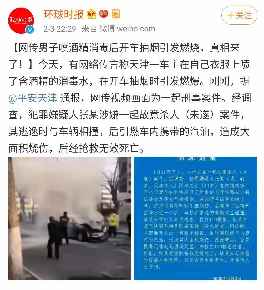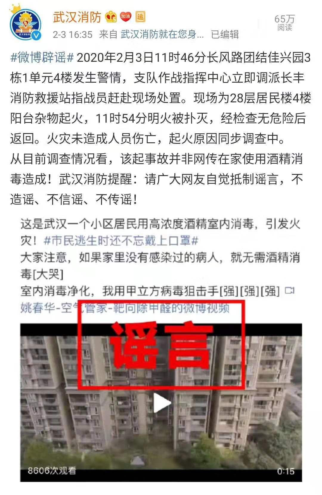 網(wǎng)上有傳言:天津南開區(qū)汾水道一車主因噴75%酒精濃度的消毒水,抽煙時(shí)不小心自燃,引發(fā)命案。無獨(dú)有偶,2月3日上午,武漢市硚口長(zhǎng)風(fēng)路一居民樓起火,有傳言稱起火原因是居民用高濃度酒精室內(nèi)消毒。