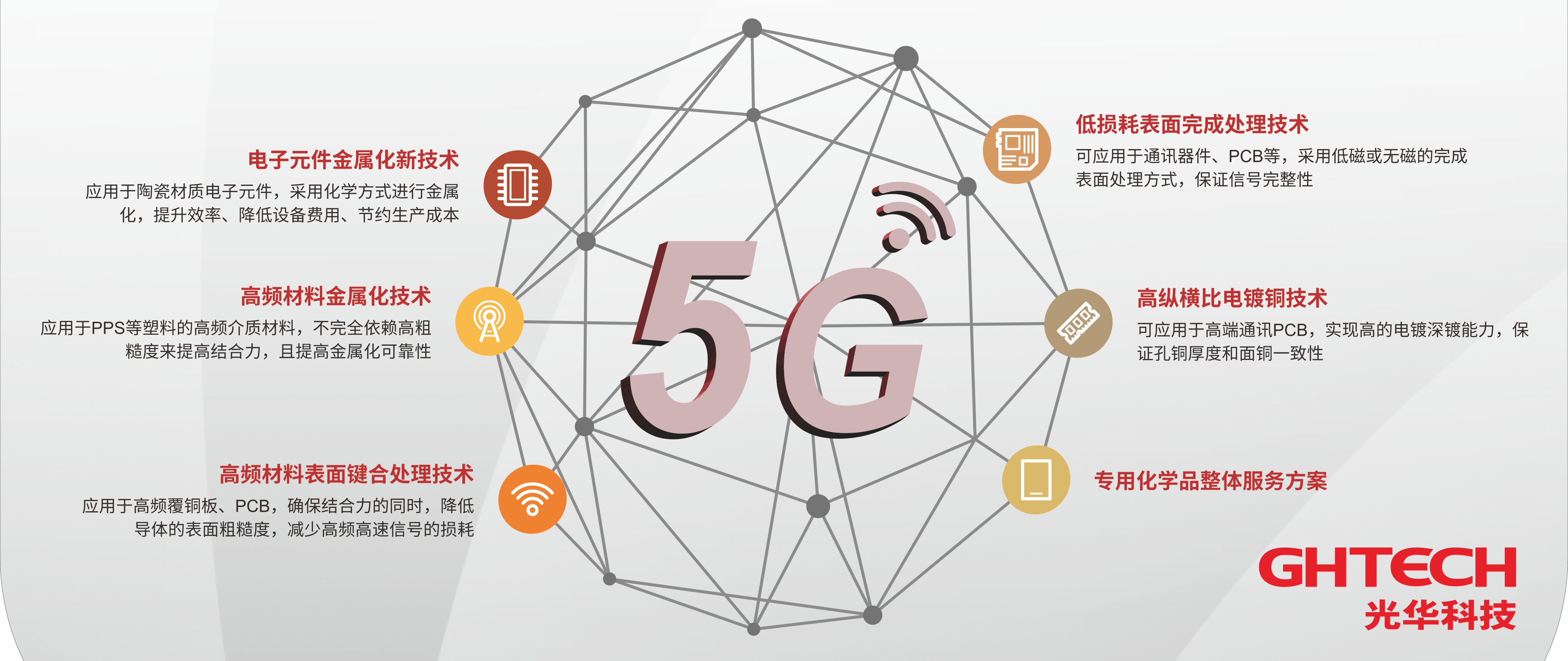 21世紀(jì)的第二個十年,全球經(jīng)濟(jì)形勢多變,特別是5G通信+IoT物聯(lián)時代的到來,5G引領(lǐng)高頻、高速時代,IoT物聯(lián)應(yīng)用將順利實(shí)現(xiàn)交互,將帶來全球產(chǎn)業(yè)鏈的重組和躍升。光華科技洞察最前沿技術(shù)變革,當(dāng)前正圍繞國家重點(diǎn)關(guān)注的5G領(lǐng)域展開關(guān)鍵核心技術(shù)攻關(guān),重點(diǎn)開發(fā)與5G基站、5G天線、終端的射頻模塊以及其他電路或元器件等相配套的關(guān)鍵電子化工新材料。目前,光華科技已設(shè)計(jì)并合成了一系列5G新型鍵合劑;已攻克化學(xué)鈀與化學(xué)金在銅面直接沉積的技術(shù)難題;已開發(fā)出具有自主核心知識產(chǎn)權(quán)的脈沖電鍍添加劑……同時,光華科技與下游產(chǎn)業(yè)、應(yīng)用終端形成產(chǎn)業(yè)鏈協(xié)同開發(fā)的合作模式,共同推動國內(nèi)5G技術(shù)的發(fā)展進(jìn)程。