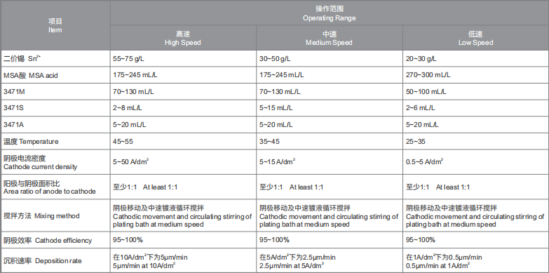 3471 is a matte tin potion exclusively designed in accordance with the characteristics of continuous plating. It can ensure dense and uniform tin coating while ensuring the electroplating efficiency, thus ensuring excellent ability to resist discoloration as well as excellent weldability of the product. It is applicable to roll-to-roll continuous matte tin plating process.