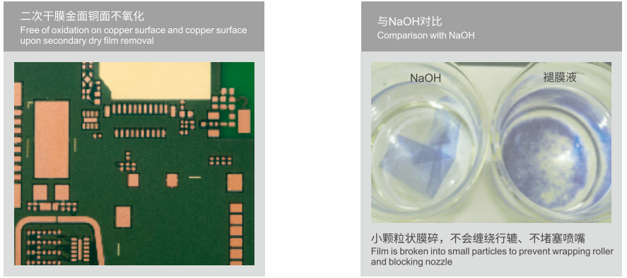 It is used for the removal of inner dry film, outer dry film and ENIG selective dry film during PCB manufacturing, and in particular applicable to the removal of dry film for fine circuit, and applies to the film removal for IC substrate and MSAP process. 。